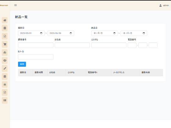 撮影プランや商品を登録し、納品書や領収書を出力することができます。入金状況の管理やカメラマン・アシスタントを登録することも可能です。