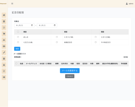お客様の生年月日を基準にして、イベントに日程を設定するだけで顧客データの中から、対象の方を簡単に抽出ができ、そのままメールにて お客様にアプローチが可能です。 出産から七五三や、入園式、卒園式、入学式、卒業式 成人式、結婚式からダイヤモンド婚まで、色々なイベントにお客様の 記念の1枚を、記憶に残る撮影をご案内可能なシステムです。